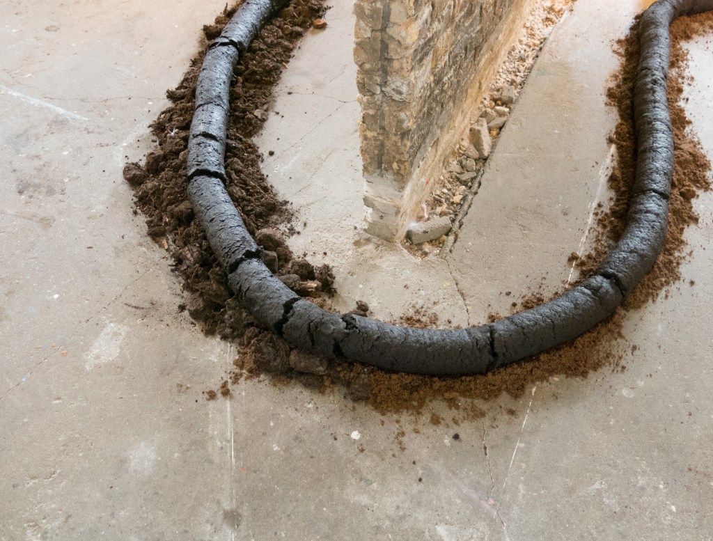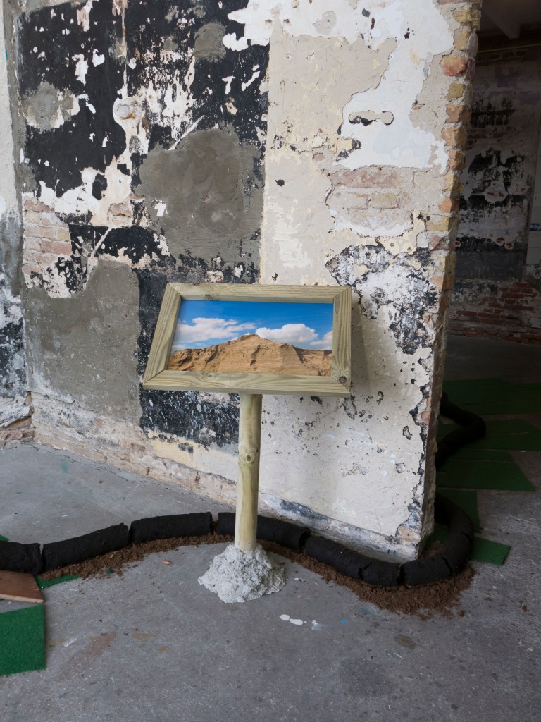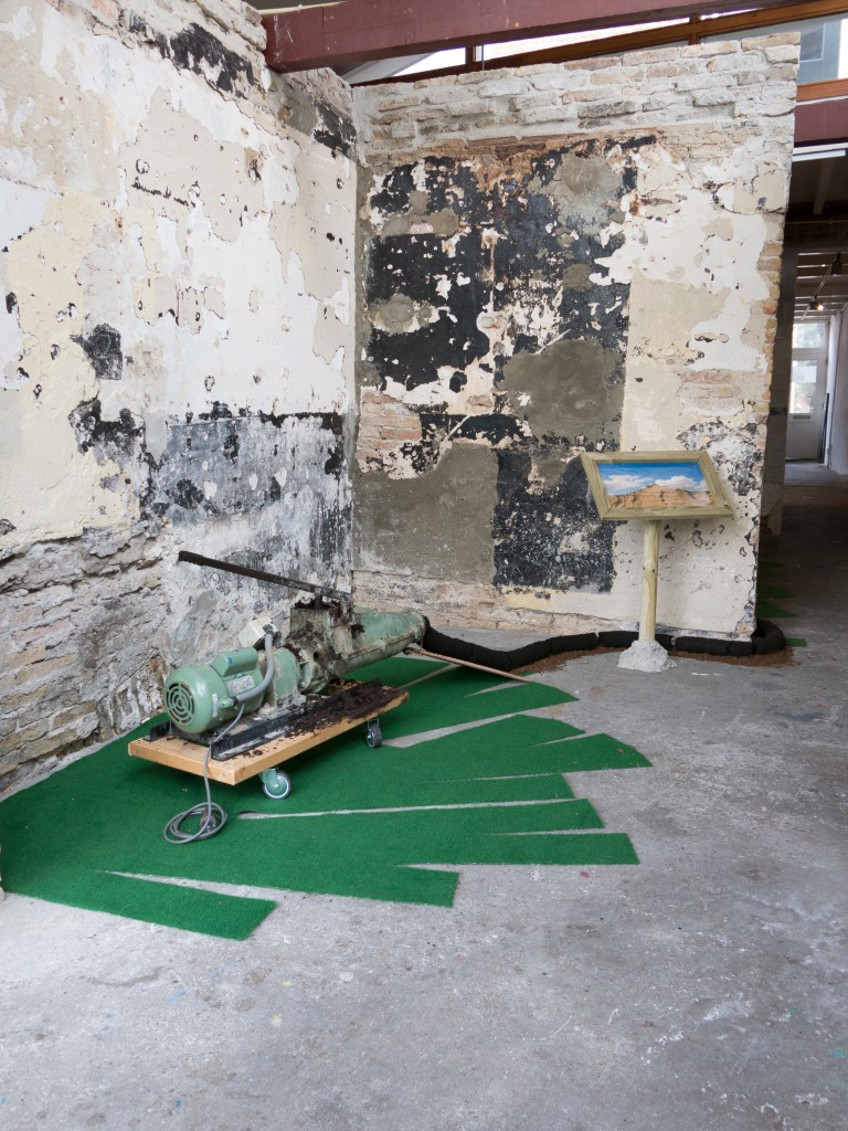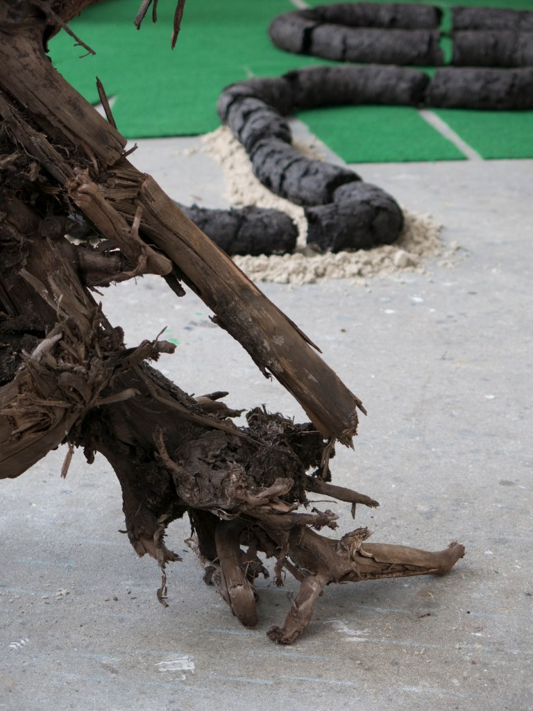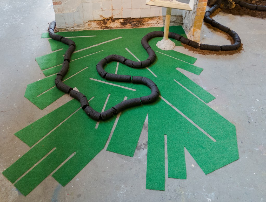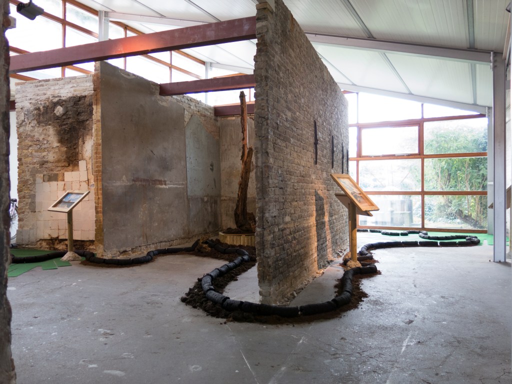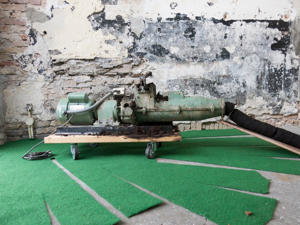 2017, installation, peat, soil, wood, carpet, clay extruder, posters (30 x 45 cm), concrete, glass, tree trunks