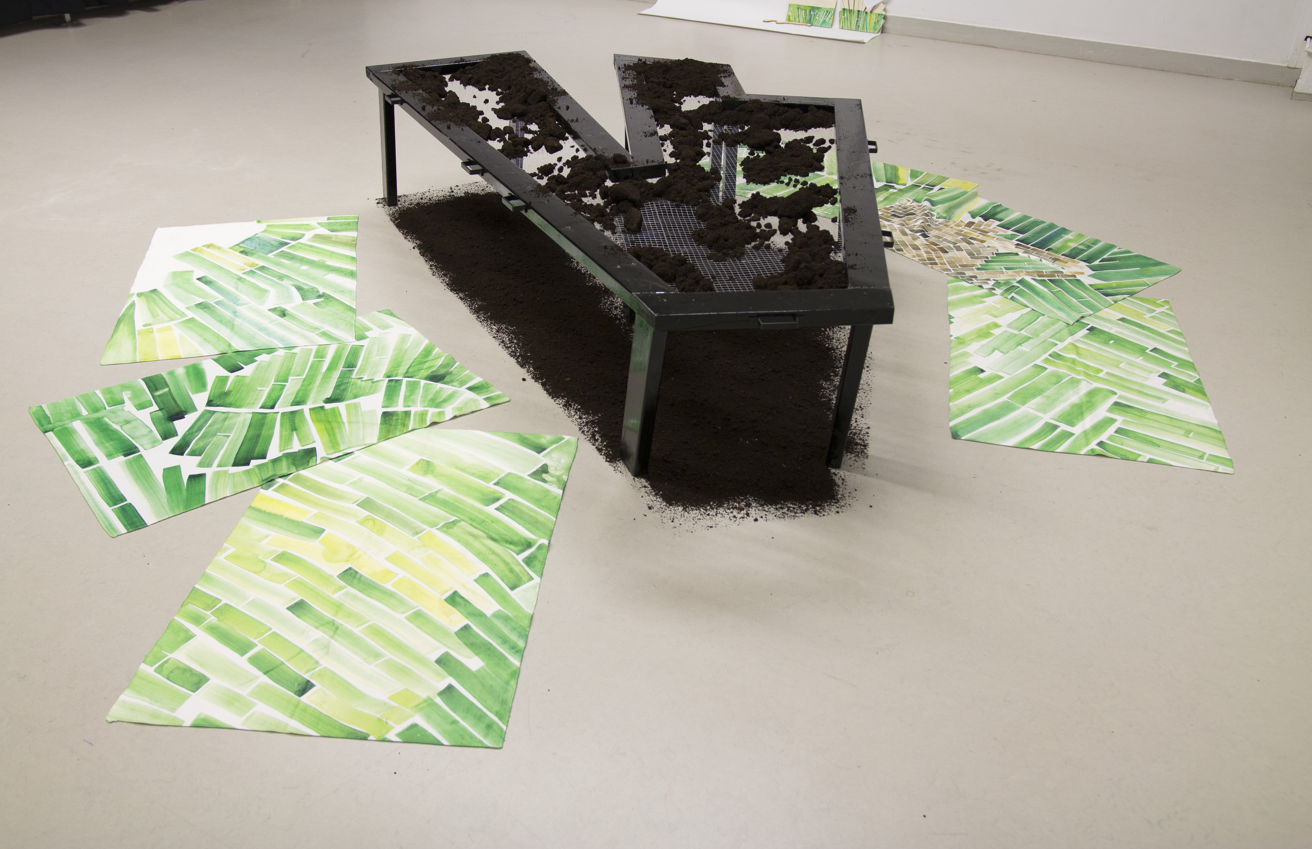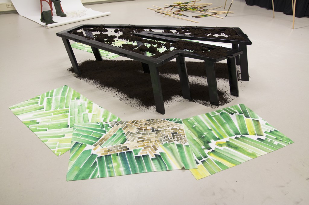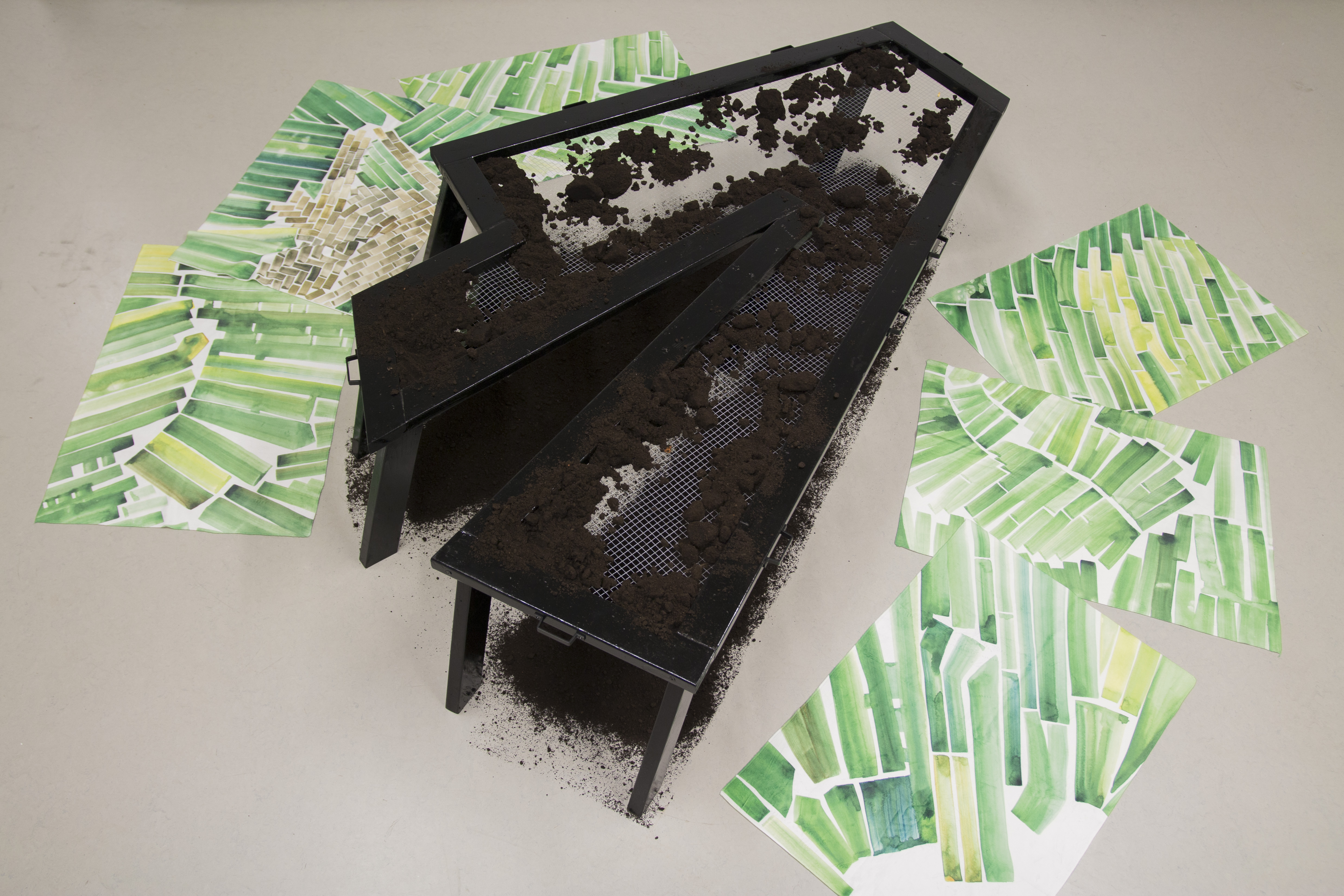Sift for a shift 2018, installation, wood, varnish, metal wire, soil, printed blankets (70 x 100 cm) Like Loading...