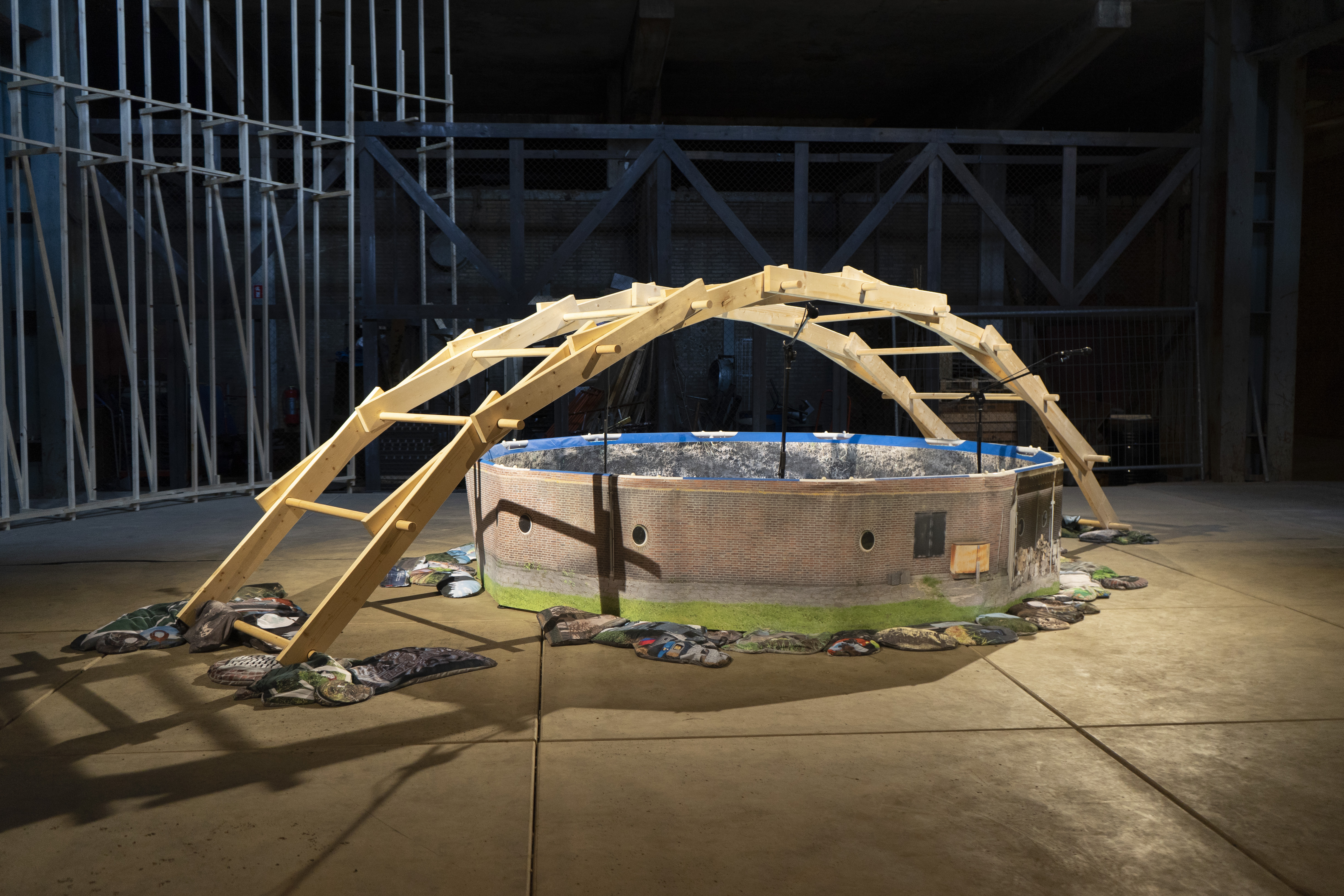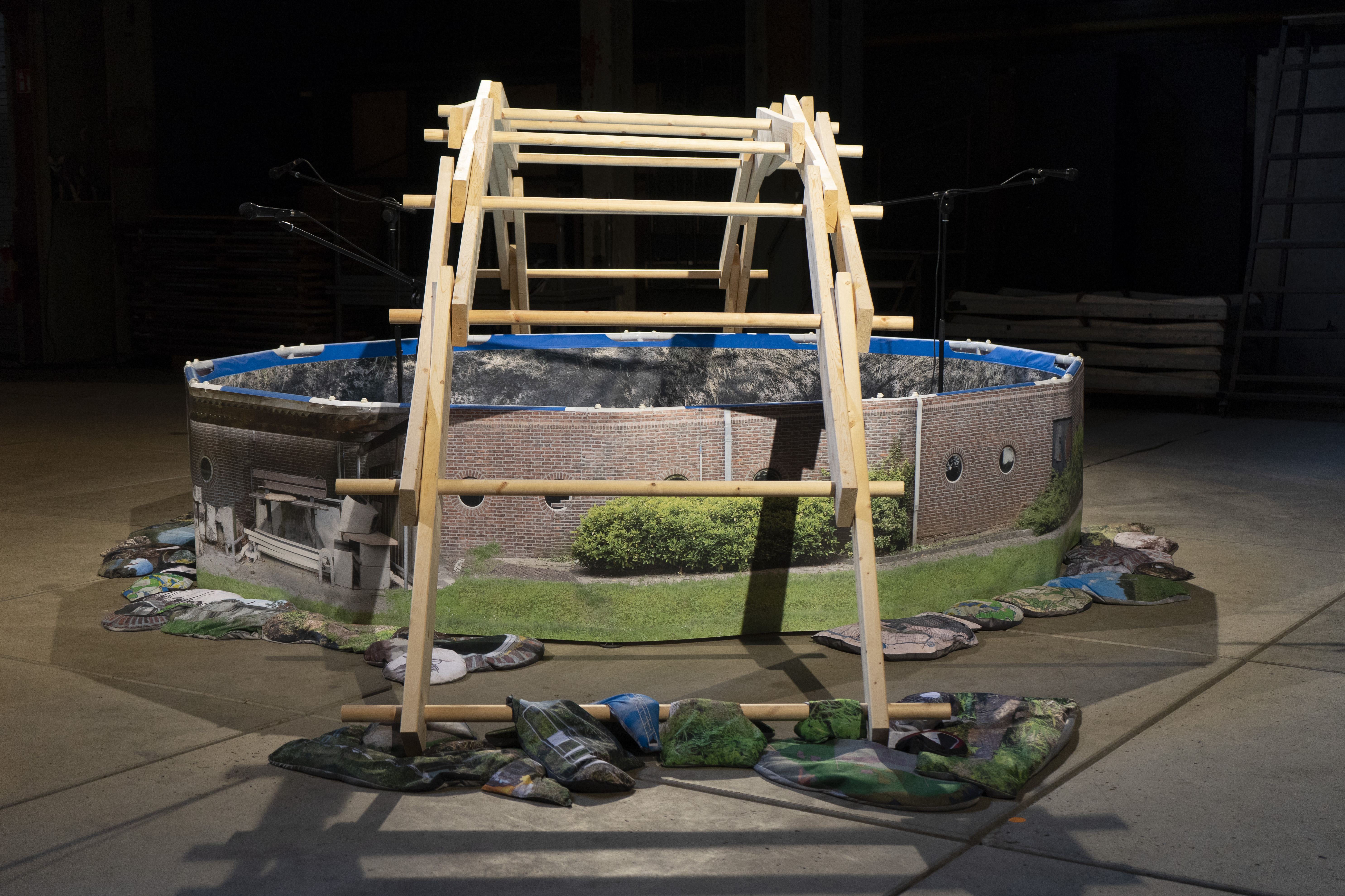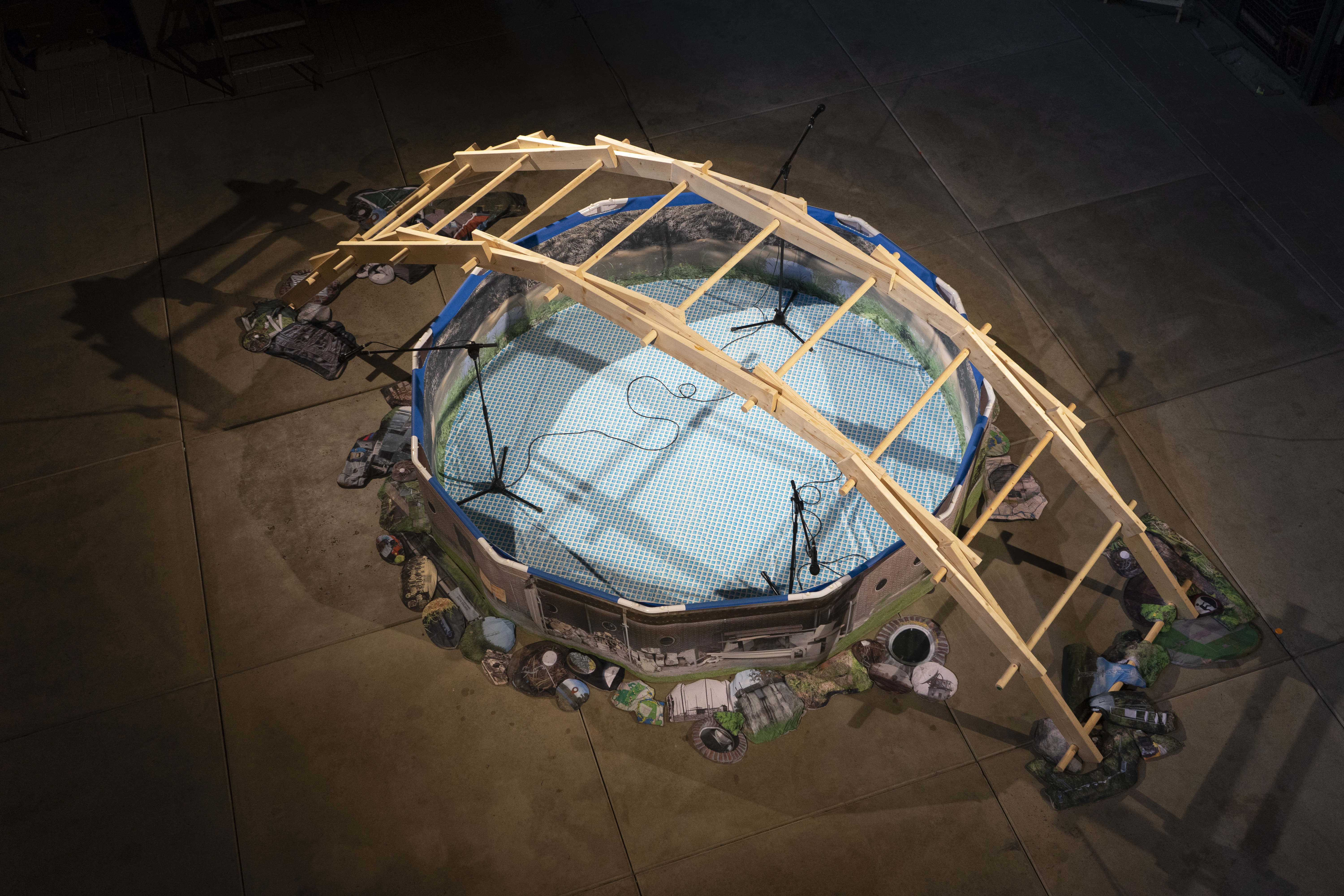 Wood, swimming pool, print on PVC, sand, print on polyester fabric, microphones