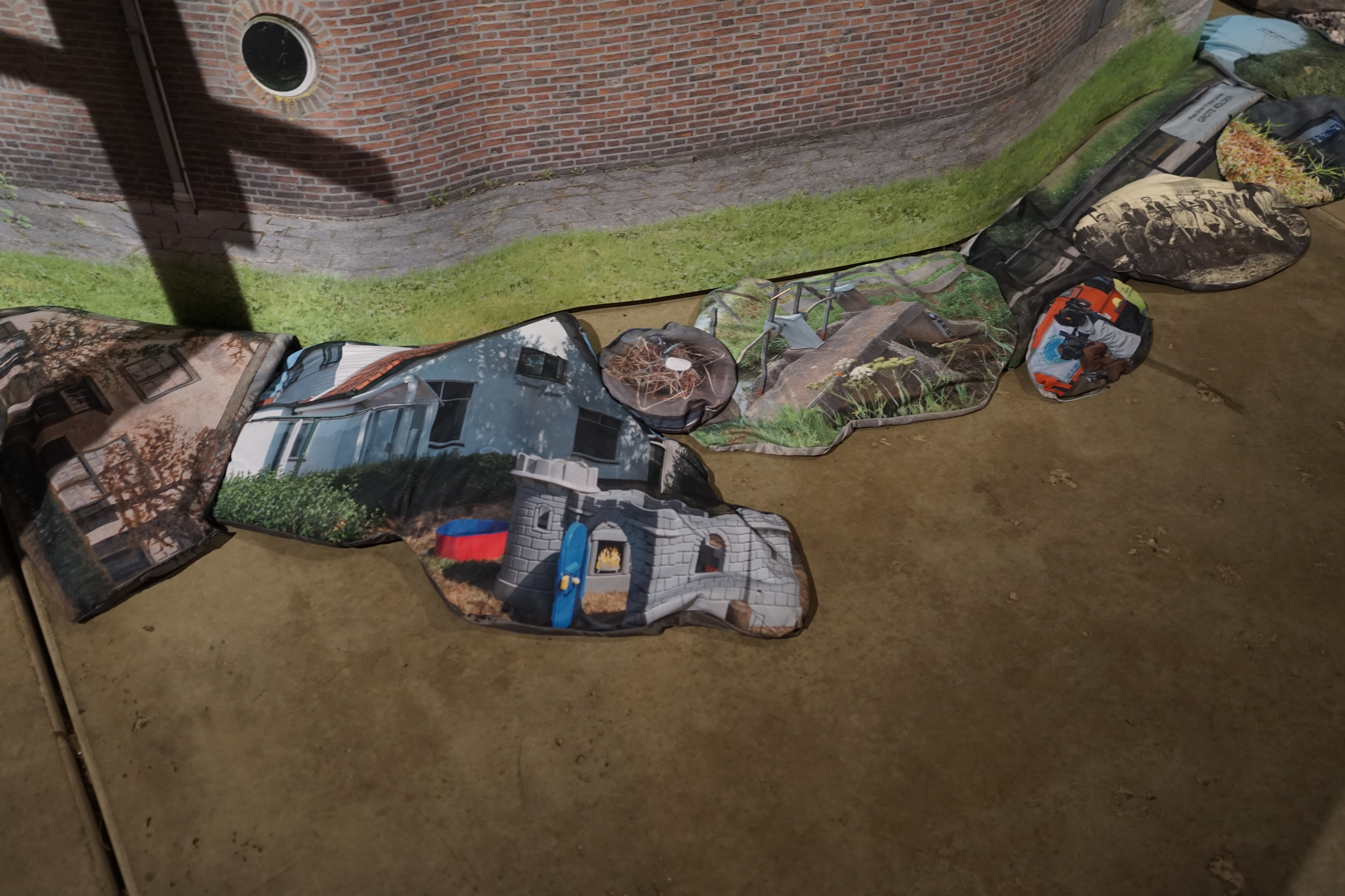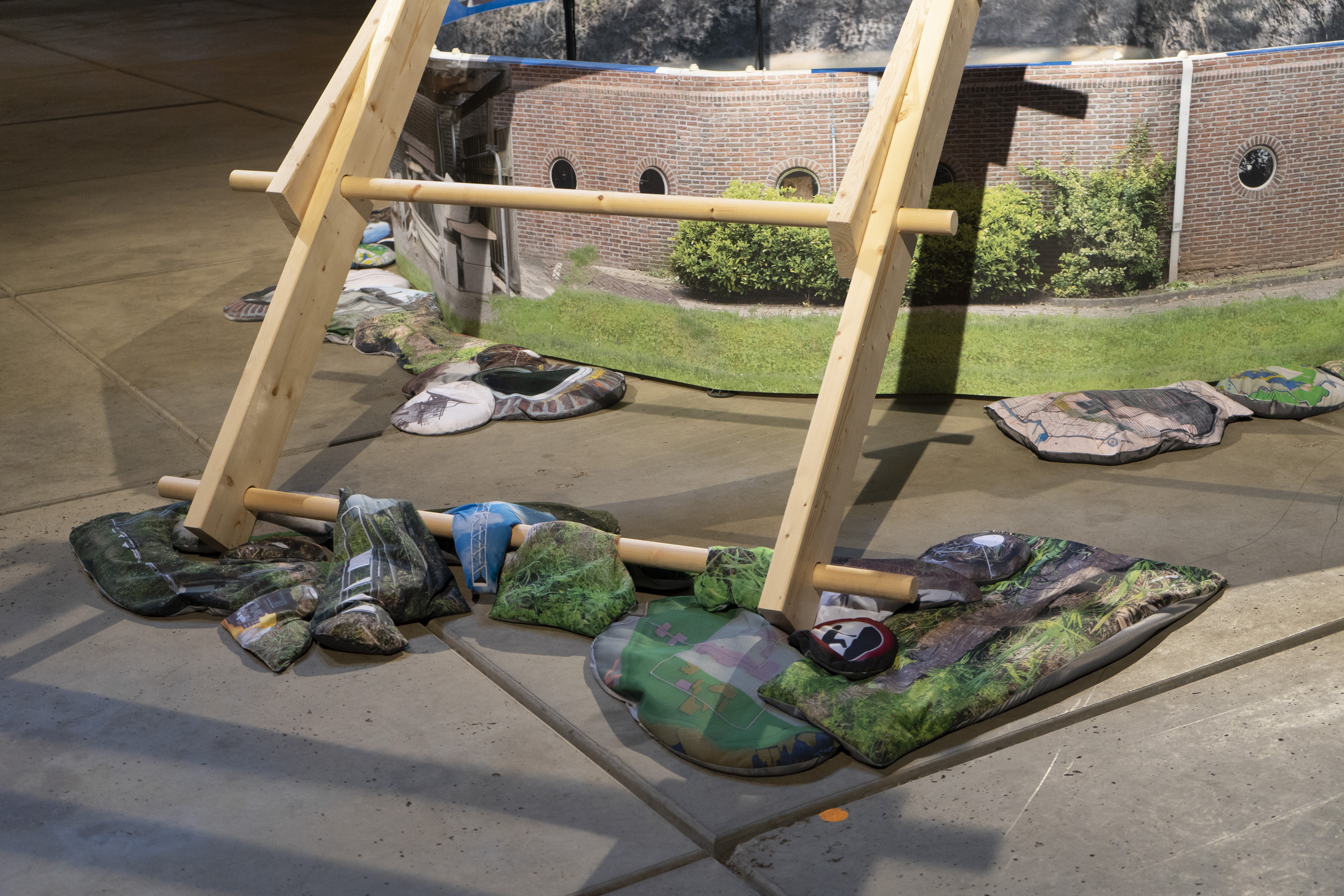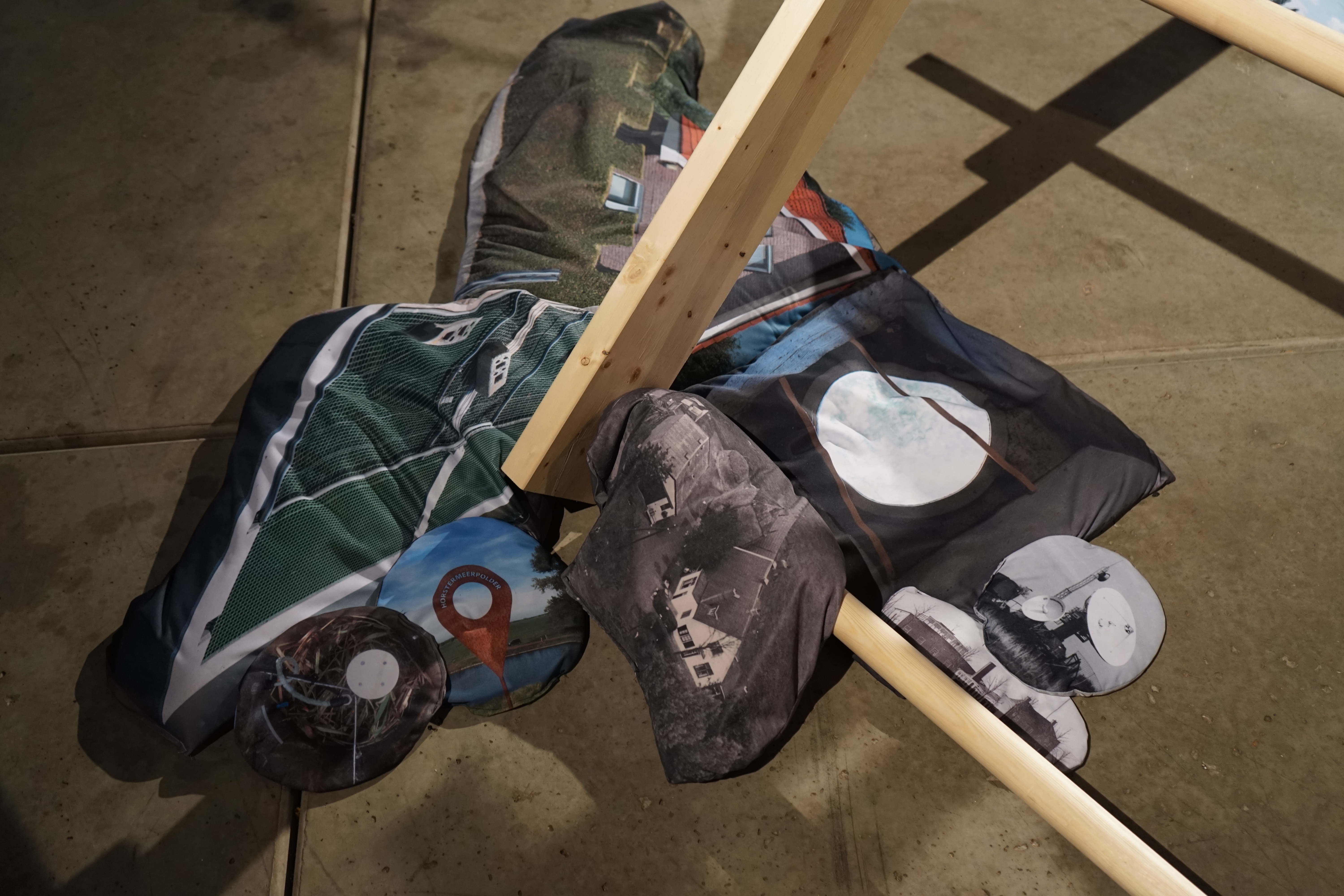 Wood, swimming pool, print on PVC, sand, print on polyester fabric, microphones