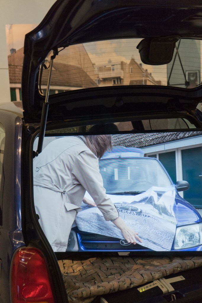 2019, installation, car, printed media, two-channel video (duration 20:53 min) with sound